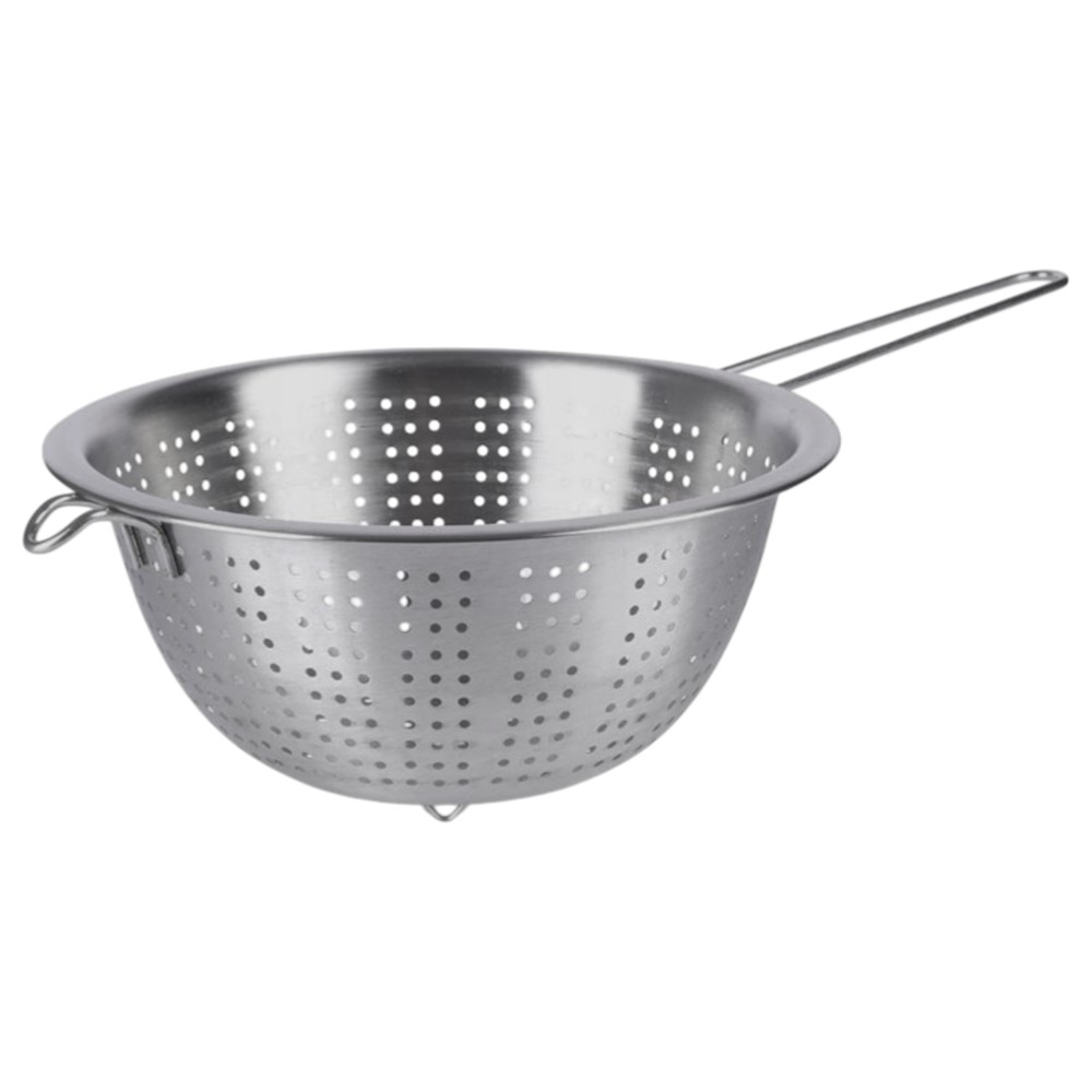 This practical colander with a handle is designed for easy and safe use during food preparation. With a diameter of 24 cm, a total length of 42 cm (including the handle) and a height of 13 cm, it offers enough space for draining pasta, vegetables or fruit. Made of high-quality stainless steel in a silver color, this colander combines functionality with durability. The ergonomic handle makes it easy to hold and use even when fully filled.