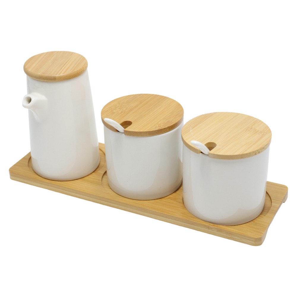 Set of three holders for spices and oil, made of ceramics and bamboo, in white and brown. Provides an appropriate choice for everyday organization in the kitchen.