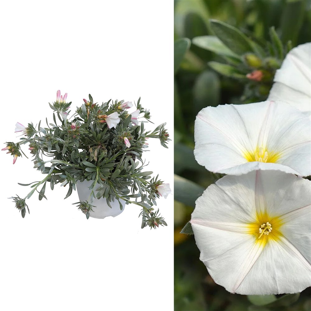 Growing bush convolvulus plants is easy. This low maintenance plant requires very little care yet, it will reward you with lovely year-round foliage and copious blossoms spring through fall. Silvery foliaged shrub that comes from the Mediterranean region of Europe. It has a neat, dense round shape .This evergreen plant is also quite hardy, but it can be damaged by temperatures below -9 C. Its funnel-shaped, flowers are white with a pink tint. Bees and other nectar loving critters are drawn to these flowers. Plant is drought tolerant, although it does need some additional water in the desert. It requires very good drainage and lean soil, as it is susceptible to root rot and other fungal diseases. Plant it in full sun.