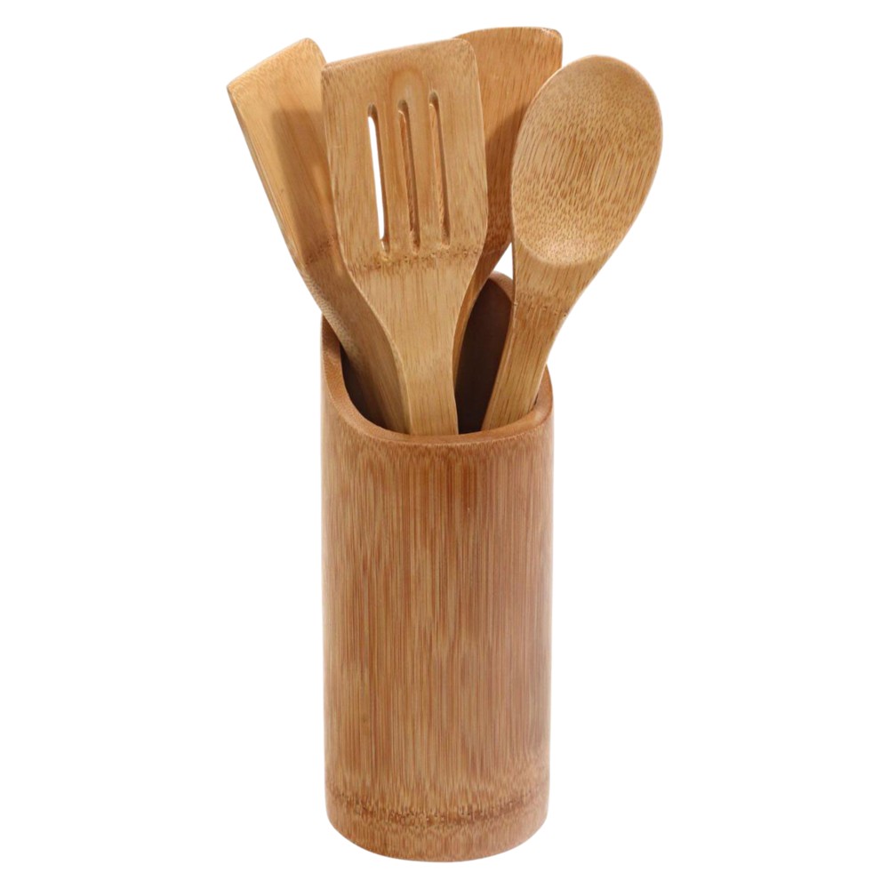 Cooking spoons in a pack of 4 and a holder to put them inside. They are made of durable and environmentally friendly bamboo wood in a natural shade.