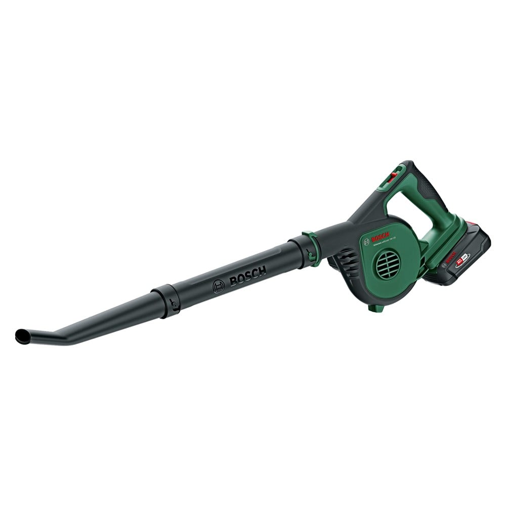 The ALB 18 LI cordless leaf blower offers the flexibility and mobility needed to work in any area of the garden. The efficient 18V lithium-ion battery ensures that this device can reach any place at any time. The device weighs only 1.8 kg and has an ergonomic handle for comfortable use. With a maximum airflow speed of 245 km/h, the leaf blower delivers effective results. The device is equipped with Syneon technology, which regulates energy consumption for optimal performance and a longer operating time. The device is part of the POWER FOR ALL ALLIANCE. A single battery can power a number of other different Bosch appliances.