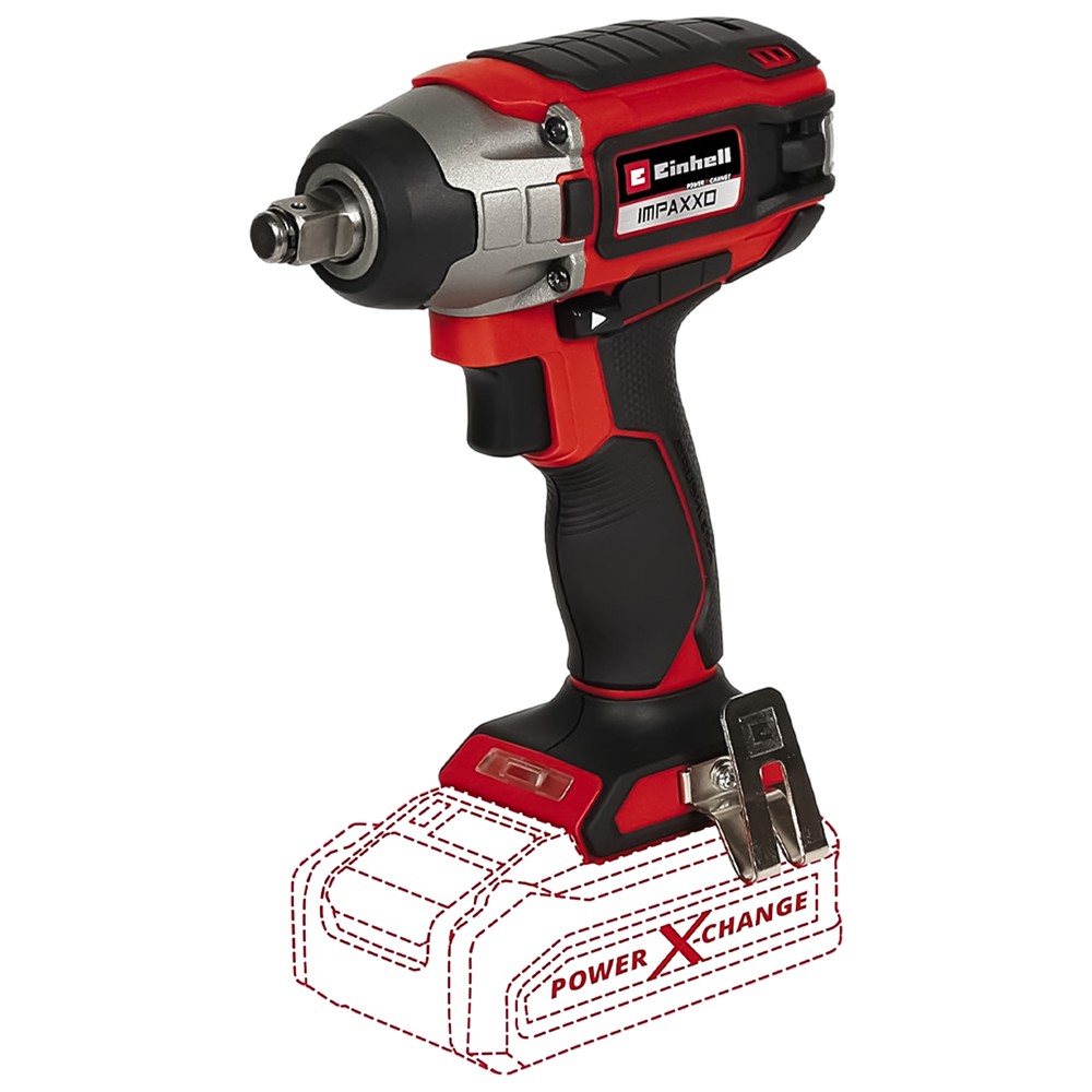 The Einhell cordless impact wrench IMPAXXO 18/230 is the perfect addition when it comes to care and maintenance of your domestic vehicle fleet. Instead of investing a great deal of time and energy in changing tyres in spring and autumn, this practical helper loosens nuts in no time at all. The powerful impact wrench provides a convenient alternative to tiring loosening by hand. The device is powered by the Einhell PurePOWER brushless motor. This brushless motor offers more power and a longer running time than conventional carbon brush motors. After registering online, the brushless motor comes with a 10-year warranty. The cordless impact wrench is also a member of the Power X-Change family. The battery with the high-quality lithium-ion technology and a charger is used on all Power X-Change models. The advantage is obvious: Disturbing cables, "trip hazards" and undesired distractions due to limited freedom of movement are a thing of the past with the new, powerful and durable generation of Einhell cordless tools. This makes it possible to work quickly and safely on all wheels. The high torque of the powerful cordless impact wrench ensures sufficient force to loosen even tightly seated, wedged or rusted nuts in no time. Despite its performance, the IMPAXXO 18/230 is a lightweight in its class, which makes it comfortable to use. The impact wrench has a robust 1/2" square socket, and delivery includes a bit adapter for screwing. The integrated LED light for illuminating the working area also allows a quick tyre change when it matters: when sunset is creeping up on you, in darkness or in garages without sufficient lighting. Delivery does not include a battery or charger. These are available separately as a starter kit