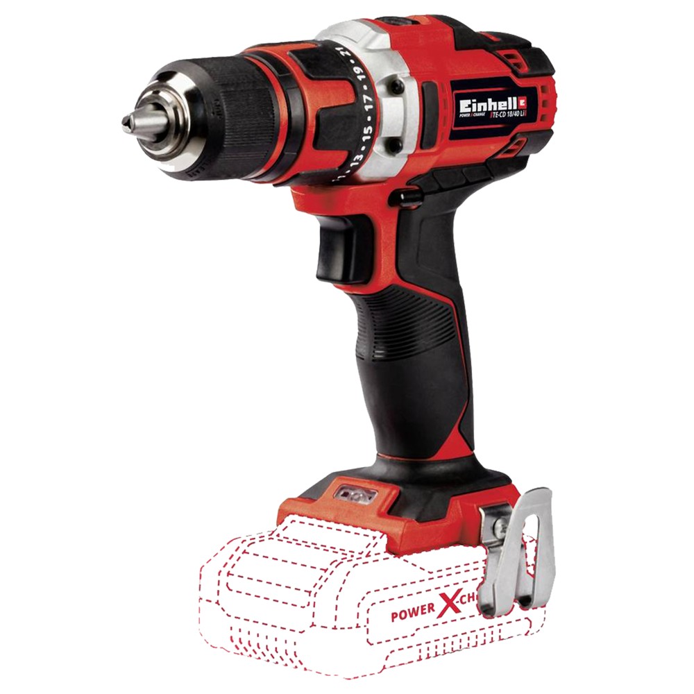 The Einhell TE-CD 18/40 Li-Solo cordless drill is a powerful and handy allrounder for all jobs around the home, workshed and garage. Being a member of the Power X-Change family, all the PXC rechargeable batteries can be used and are interchangeable in the innovative lithium-ion system family. For powerful drilling and screwdriving it has high-performance two-speed gearing. Electronic speed control ensures that the tool can be adjusted to the particular material and application at all times. Finely adjustable in 21 torque settings, the single-sleeve 13 mm drill chuck holds the accessory you want to use. For exceptionally easy handling it has an ergonomic design and softgrip. The LED lighting lights up dark areas for optimum results. Permanent operational readiness is ensured by the lithium-ion technology with zero self-discharge. The rechargeable battery and charger are available separately, for example as a practical PXC starter set in different performance levels.