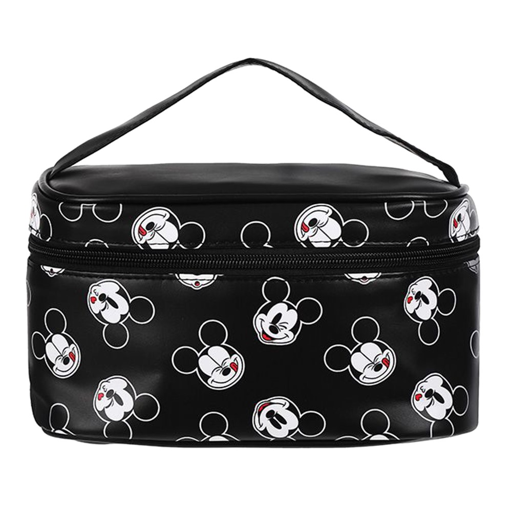 Cosmetics storage bag with top handle, made of polyester and polyurethane material, in black color and designs. It can be used for storing and carrying various cosmetic products, such as creams, shampoos, makeup products, perfumes, various lotions or other accessories. It has small dimensions, which make it suitable to take with you on trips.
