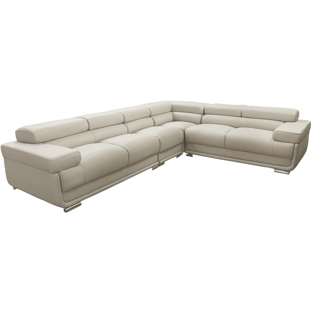 Three-piece corner sofa, with two seats on the left side, with measurements of 156x104xH93(74) cm, three seats on the right side, with measurements of 164x104xH93(74) cm, as well as a corner, with leather upholstery, in gray color. The supporting structure is composed of durable wooden bars and melamine. The medium-soft interior padding consists of high-density foam material. The sofa is equipped with 5 adjustable headrests in the upper part, which can be opened up to a height of 93 cm and allow you to adjust it as best as possible to have the most comfortable, ergonomic and natural posture. The soft natural leather upholstery material gives your living room a modern and luxurious look. The minimalistic and functional design makes this product an optimal choice for your interior environments.