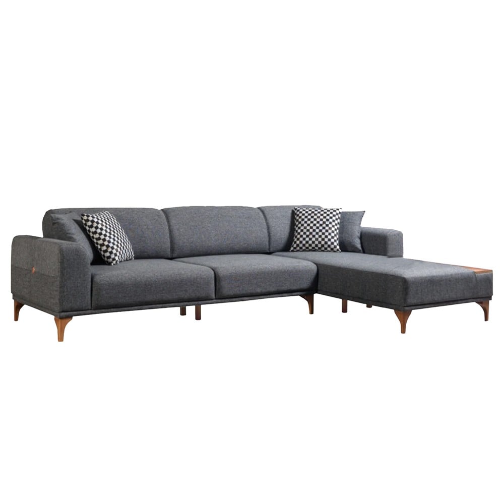 Invite your friends and family over for a movie night on the couch that offers plenty of space and style. The contemporary design of the sofa which features arms on one side, a high back, a sleek silhouette and is led by the right arm. On its side there is a wooden corner where you can charge your phone or place your coffee cup while watching TV.