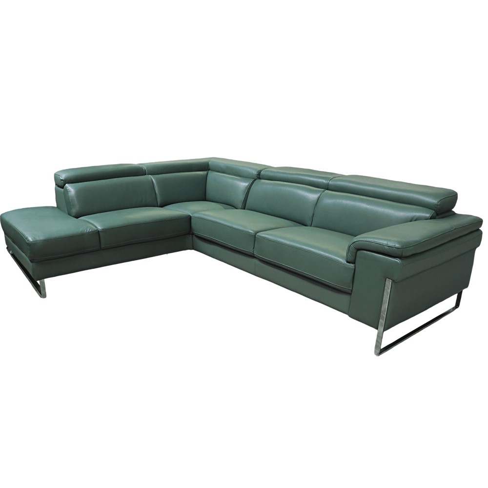 Corner sofa, with canape on the left side, with measurements of 188x337xH81(100) cm, with leather upholstery, in dark green color. The supporting structure is composed of durable wooden bars and melamine. The medium-soft inner padding consists of high-density foam materials and the outer structure is equipped with static stainless steel legs. The sofa is equipped with 3 adjustable headrests in the upper part, which can be opened up to a height of 100 cm and allow you to adjust it as best as possible to have the most comfortable, ergonomic and natural posture. The soft natural leather upholstery material gives your living room a modern and luxurious look. The minimalistic and functional design makes this product an optimal choice for your interior environments.