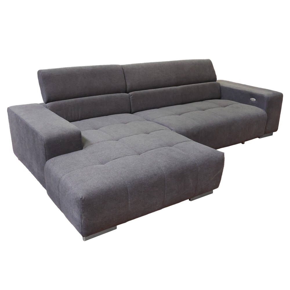 Corner sofa, with canape on the left side, with measurements of 307x73(92)x186 cm, with textile upholstery, in grey color. The supporting structure is composed of durable beech and spruce wood bars, as well as melamine material, without formaldehyde content. The medium-hard inner padding consists of foam material, PVC free, with reinforcing steel springs. The sofa is equipped with movable headrests, which can be adjusted to provide maximum comfort, as well as it has a retractable seat and static chrome legs with a height of 6.5 cm. The upholstery material is stain resistant and can be easily cleaned with a damp cloth. The minimalistic and functional design makes this product an optimal choice for your interior environments.