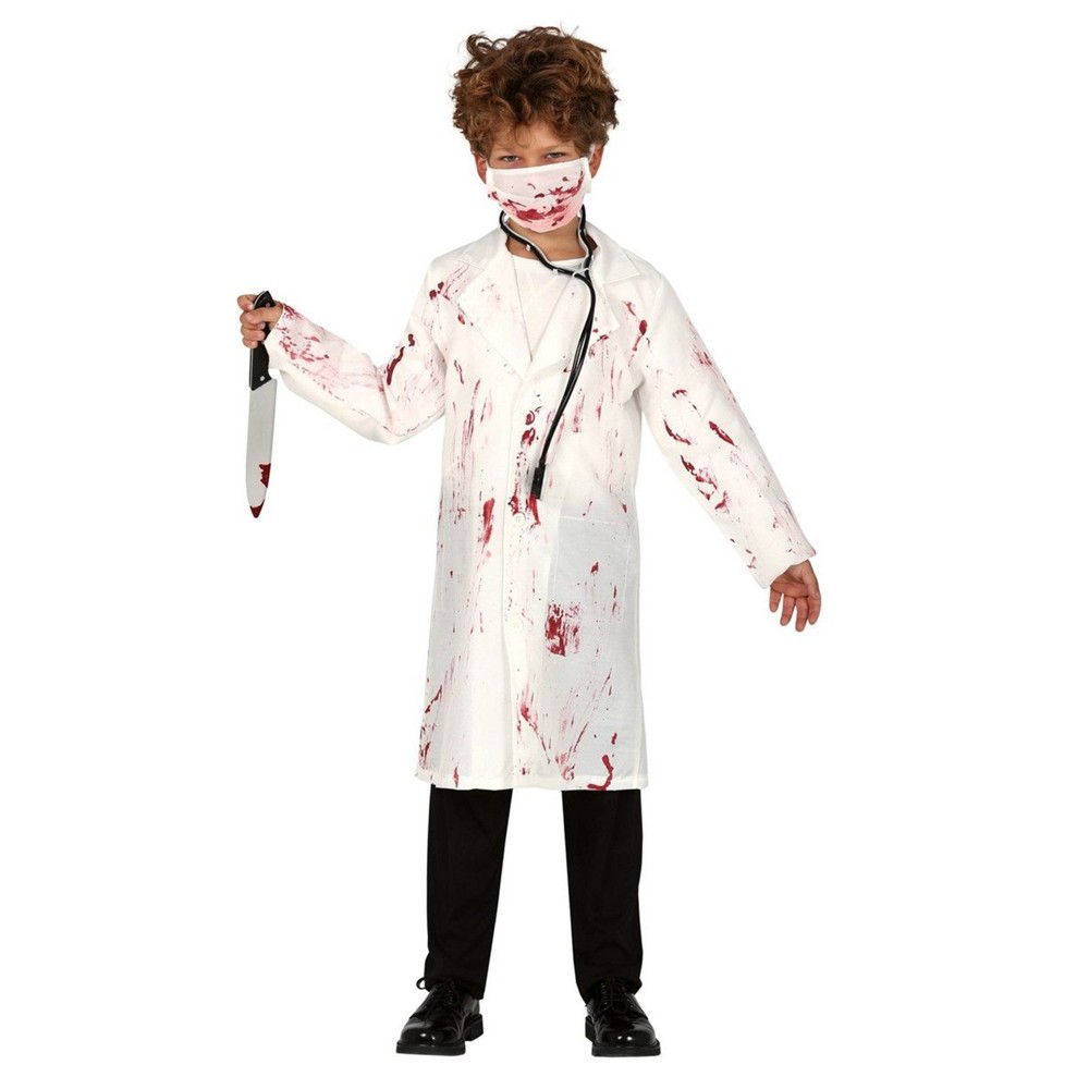 Crazy doctor costume for children, made of polyester material, in white color, with visible traces of artificial blood. The component material is soft to the touch and does not cause skin irritation. This product is suitable for use by children aged 7-9 years old, from 128 cm tall up to 134 cm tall. The costume includes the doctor apron and the face mask.