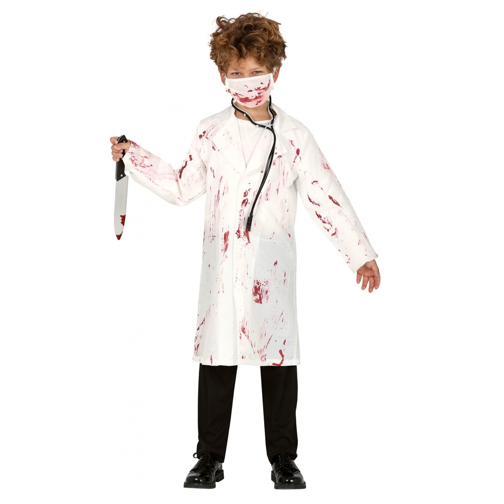 Crazy doctor costume for children, made of polyester material, in white color, with visible traces of artificial blood. The component material is soft to the touch and does not cause skin irritation. This product is suitable for use by children aged 10-12 years old, from 142 cm tall up to 148 cm tall. The costume includes the doctor apron and the face mask.