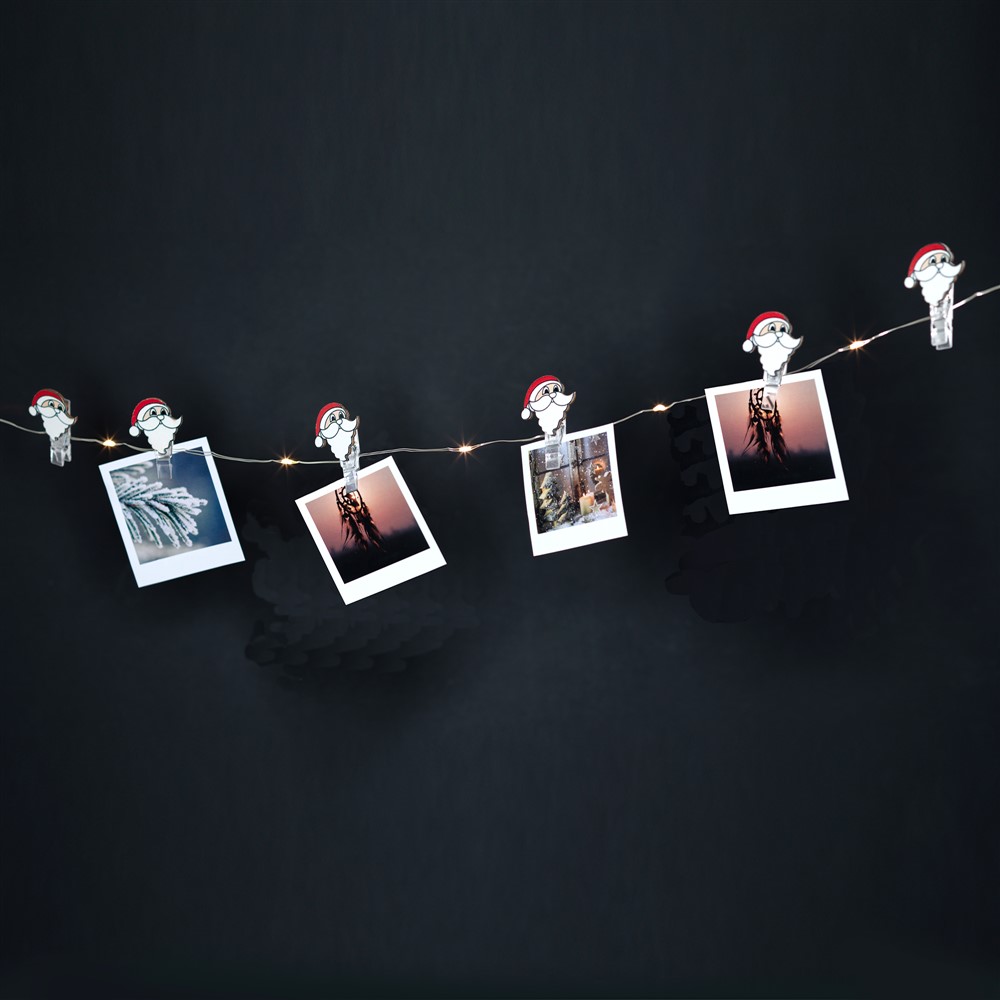Indoor decorative garland, made of copper material, with 10 LED lights and 10 clips for placing photos. Requires 2 AA batteries, which are not included in the package.