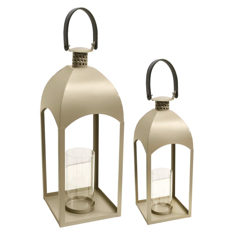 Add a touch of elegance to your home decor with the decorative lantern set. The neutral beige color is easily combined with all types of furnishings. Manufactured in metal alloy construction and glass spacers to ensure quality and durability. Brighten up your environment with this modern set. Dimensions, 12x12xH30 cm; 16x16xH43 cm.