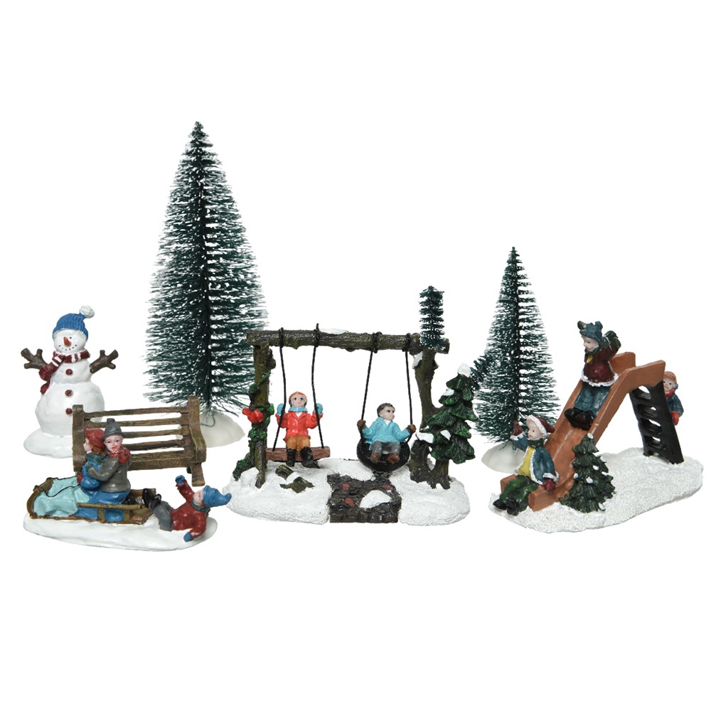 Decorative lights, set of accessories piece 7: Large tree: 7x7x15cm, tree: 4.5x4.5x10cm, bench: 5x2.5x3.5cm, snowman: 4.3x4x6.5cm slide: 8x4x5cm oscillation: 10.5x5.5x8cm slide: 12x5.5x8cm