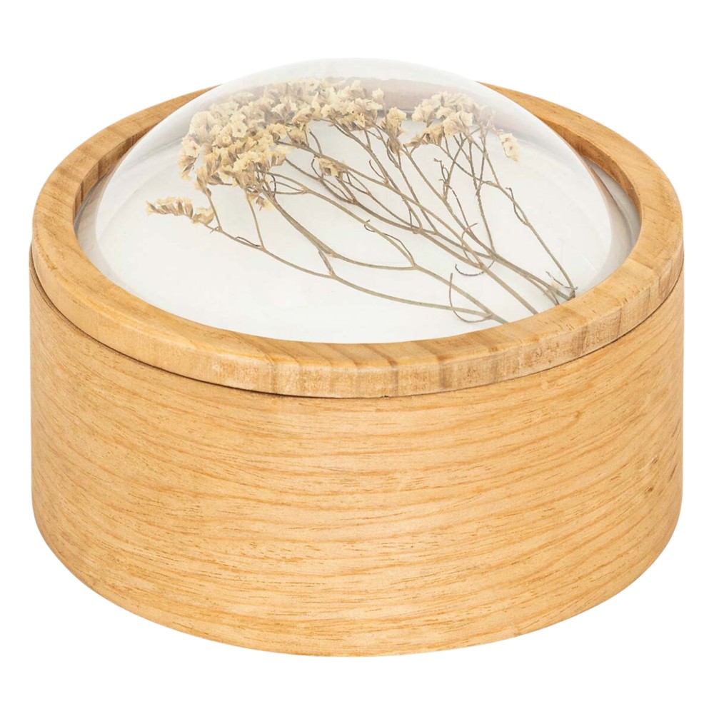 Decorative box that will add a vintage style to your space. It is made of wood in beige color. It has a curved glass lid that contains dried flowers inside. It can be used as a storage space to keep your small items but also as a decoration. Combine it with other products of the same series for a complete result in your space.