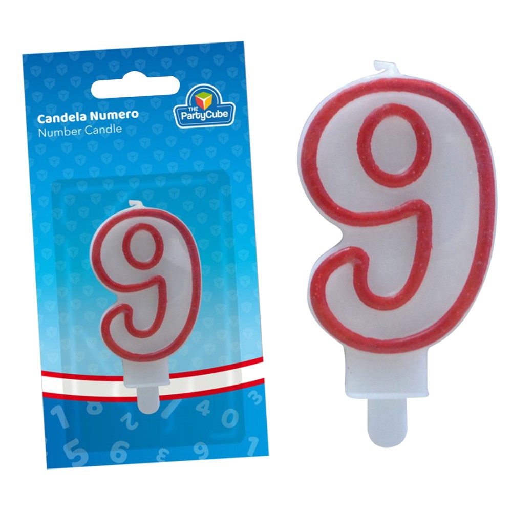 Decorative candle for parties, in the shape of the number 9, with dimensions of 6.5 cm. It is used to be placed on cakes, during birthday parties or various anniversaries.
