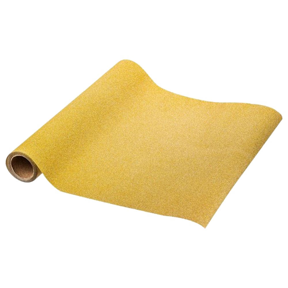 Decorative fabric, made of polypropylene and PET synthetic fiber material, with dimensions of 28 cm in width and 5 m in length, in golden color with glitter. It can be placed as a decorative table runner on the top of tablecloths or it can be used to create other decorations during the Christmas and New Year holidays. This product is suitable for non-professional use, in home environments, and for professional use, by event organizing companies.