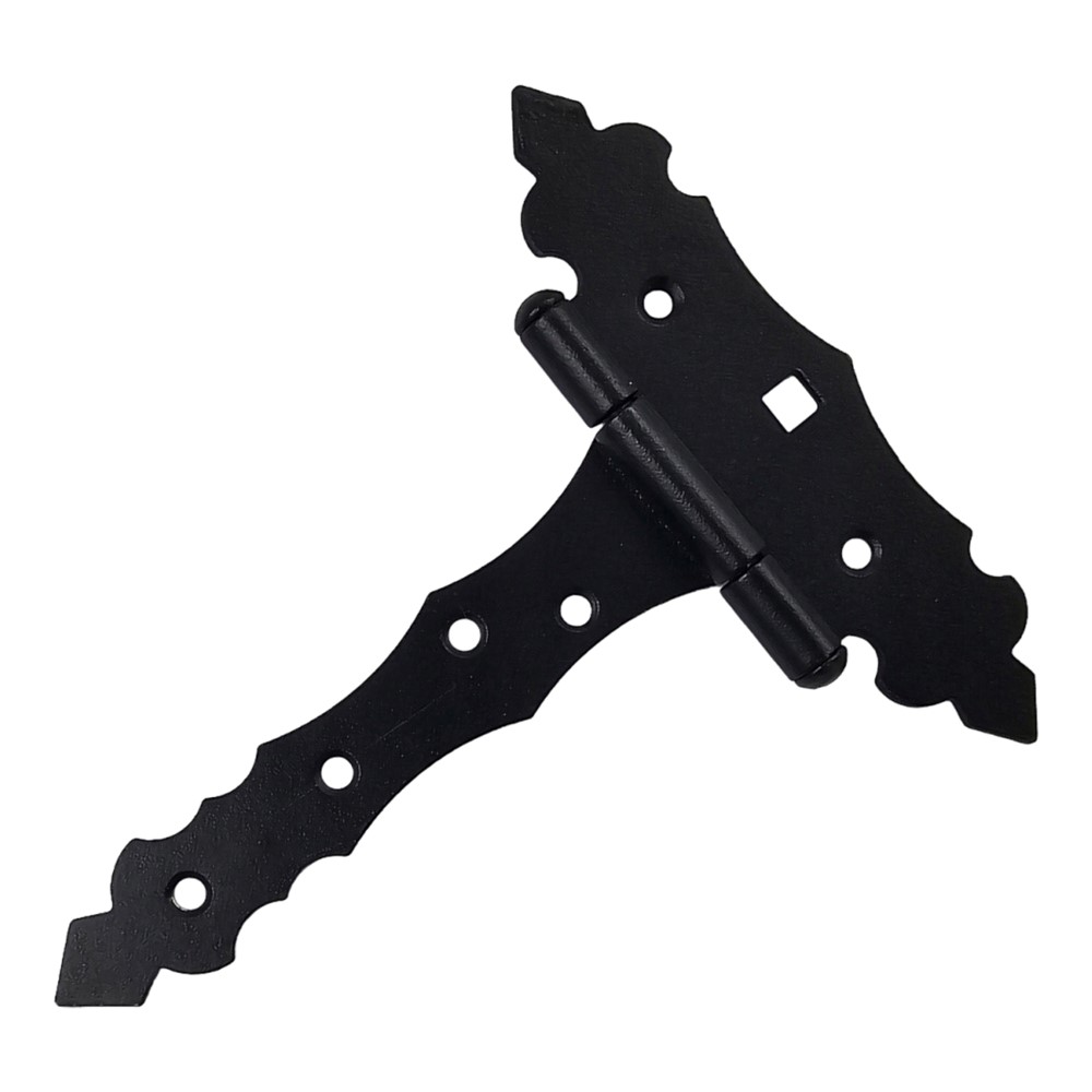 Decorative T-shaped hinge, made of galvanized zinc material, with Duplex outer coating. in black color. The component material is resistant to use, heavy weights, rust or corrosion. Used for mounting small doors, external fence doors, chest lids and other uses.
