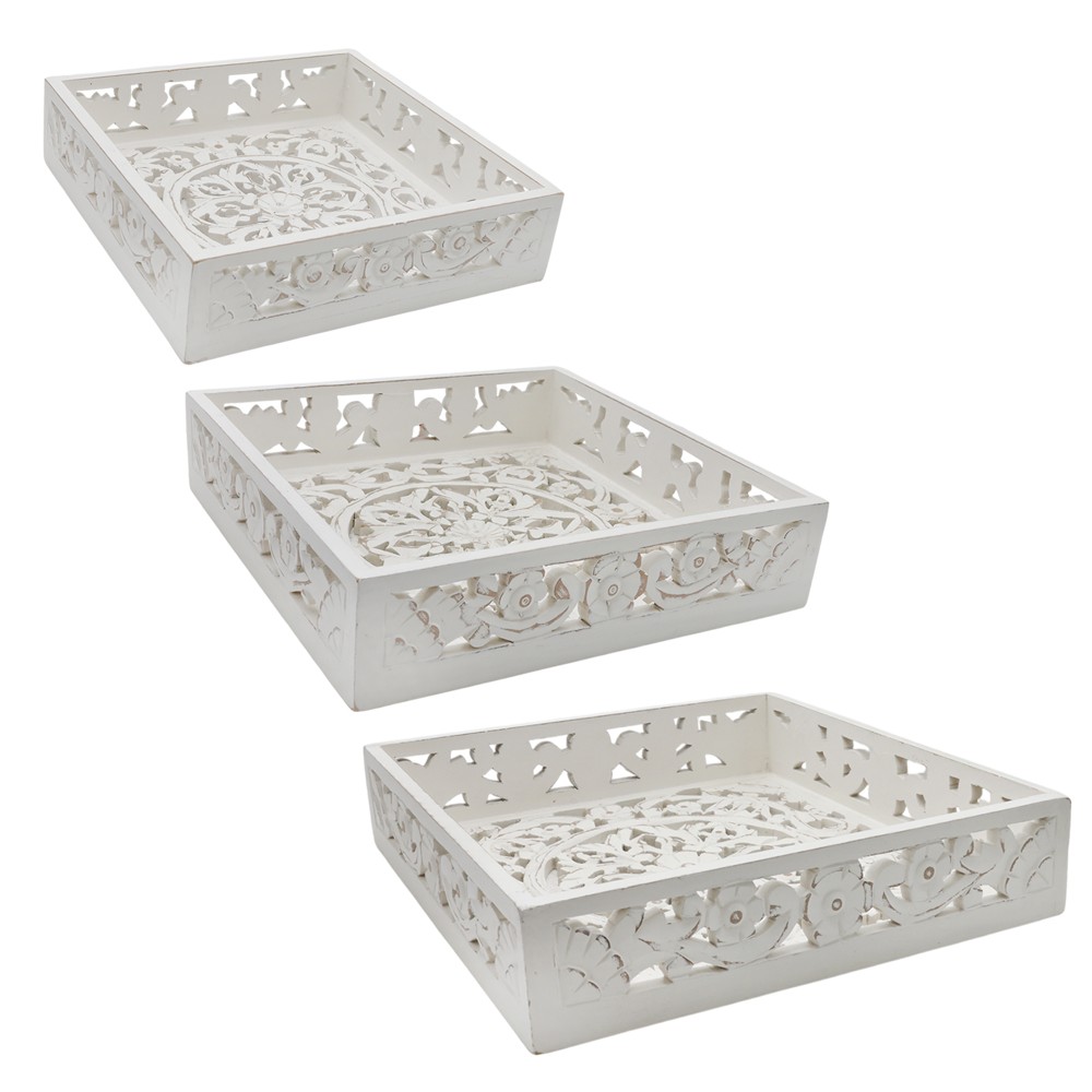 The set of decorative trays crafted from white wood offers an elegant and functional solution to decorate and organize your space. The combination of natural materials and different dimensions make this set suitable for many environments and decoration styles. It offers an elegant and organized way to display and store your precious objects.