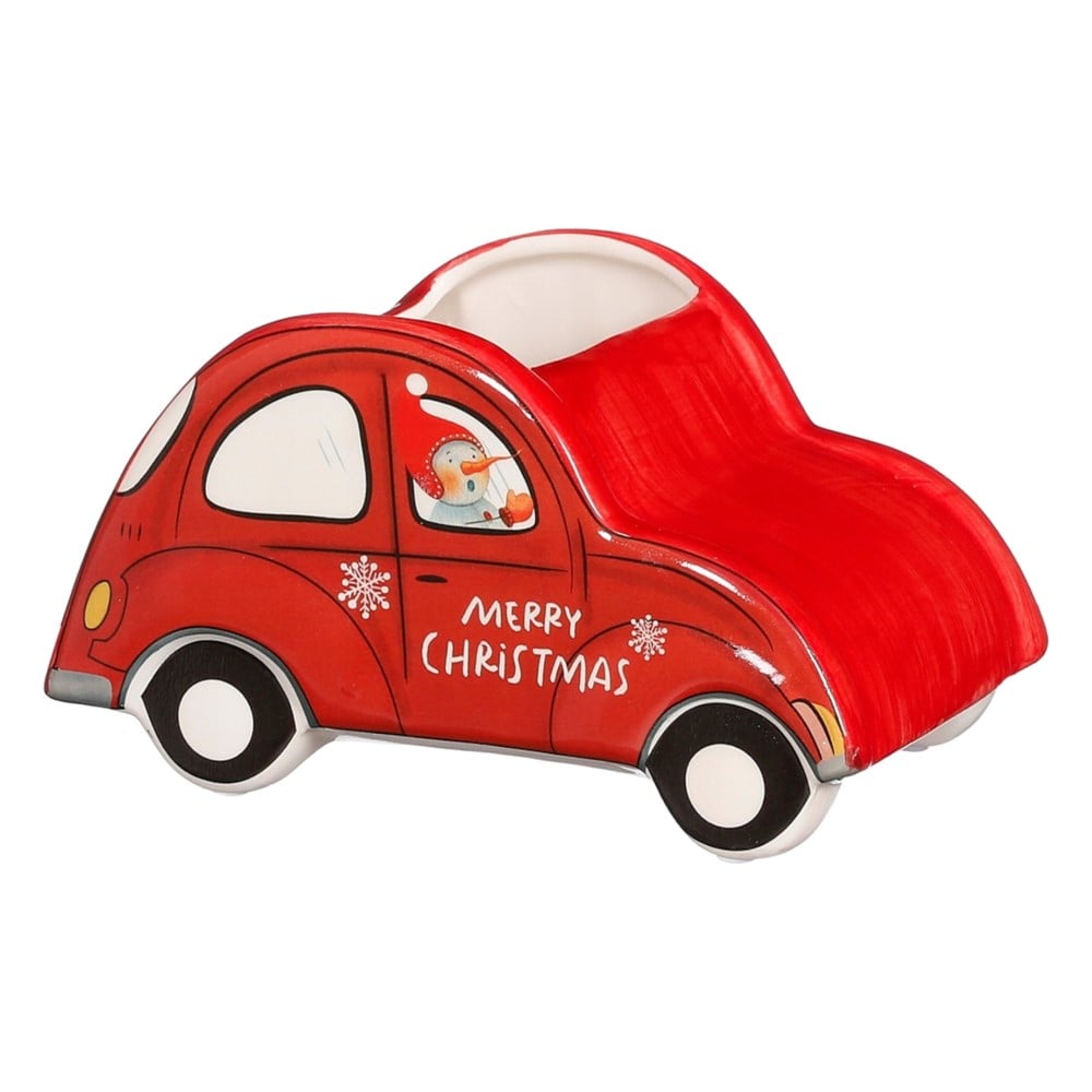 The decorative vase in the shape of a car is an excellent element for decorating your home. It is made of ceramic and is red. The dimensions of the vase are 19 cm in width and 11 cm in height, which is suitable for placing flowers, leaves or other decorations inside it.