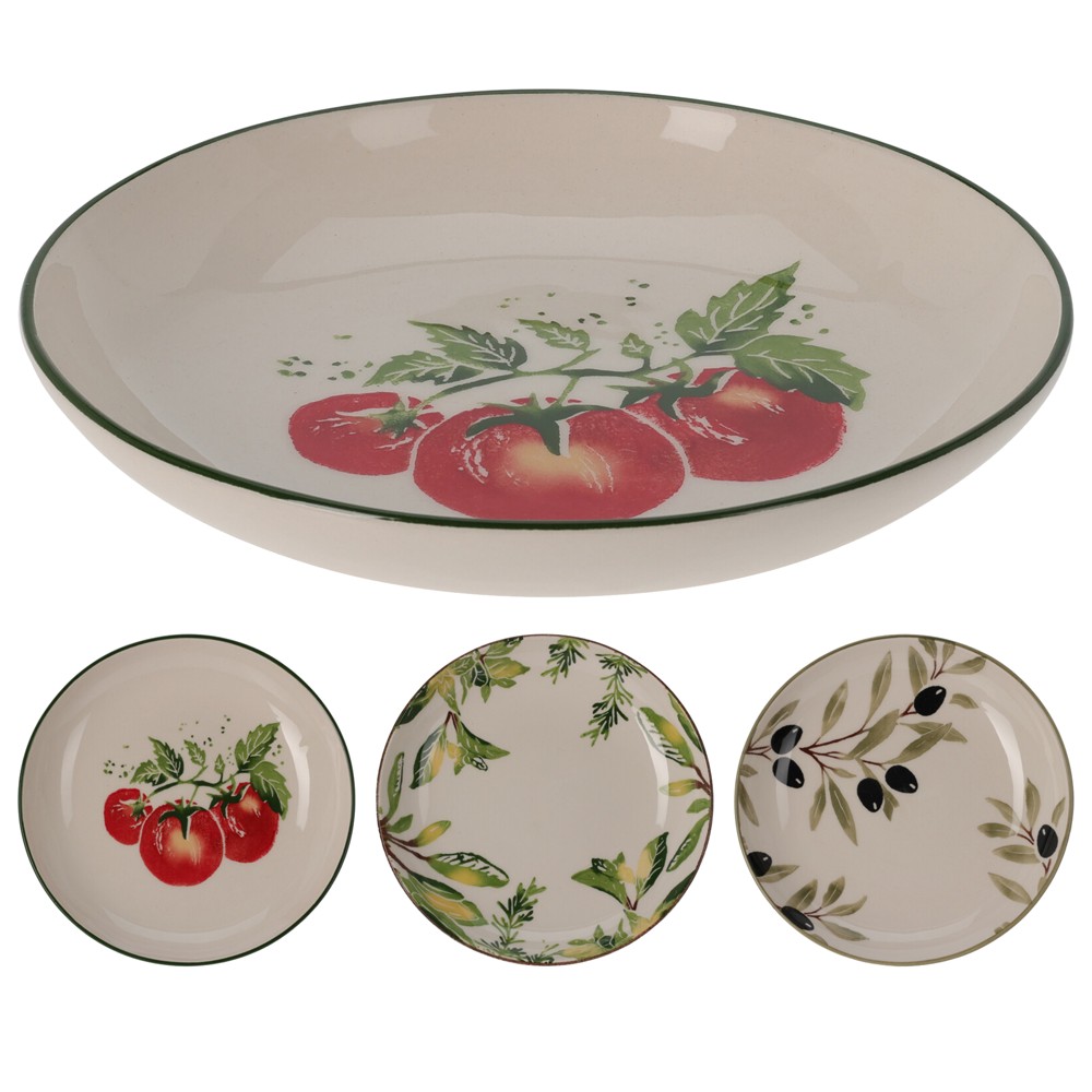 Deep plate, for serving on the table, made of ceramic, comes with different designs, which combine very nicely with each other.