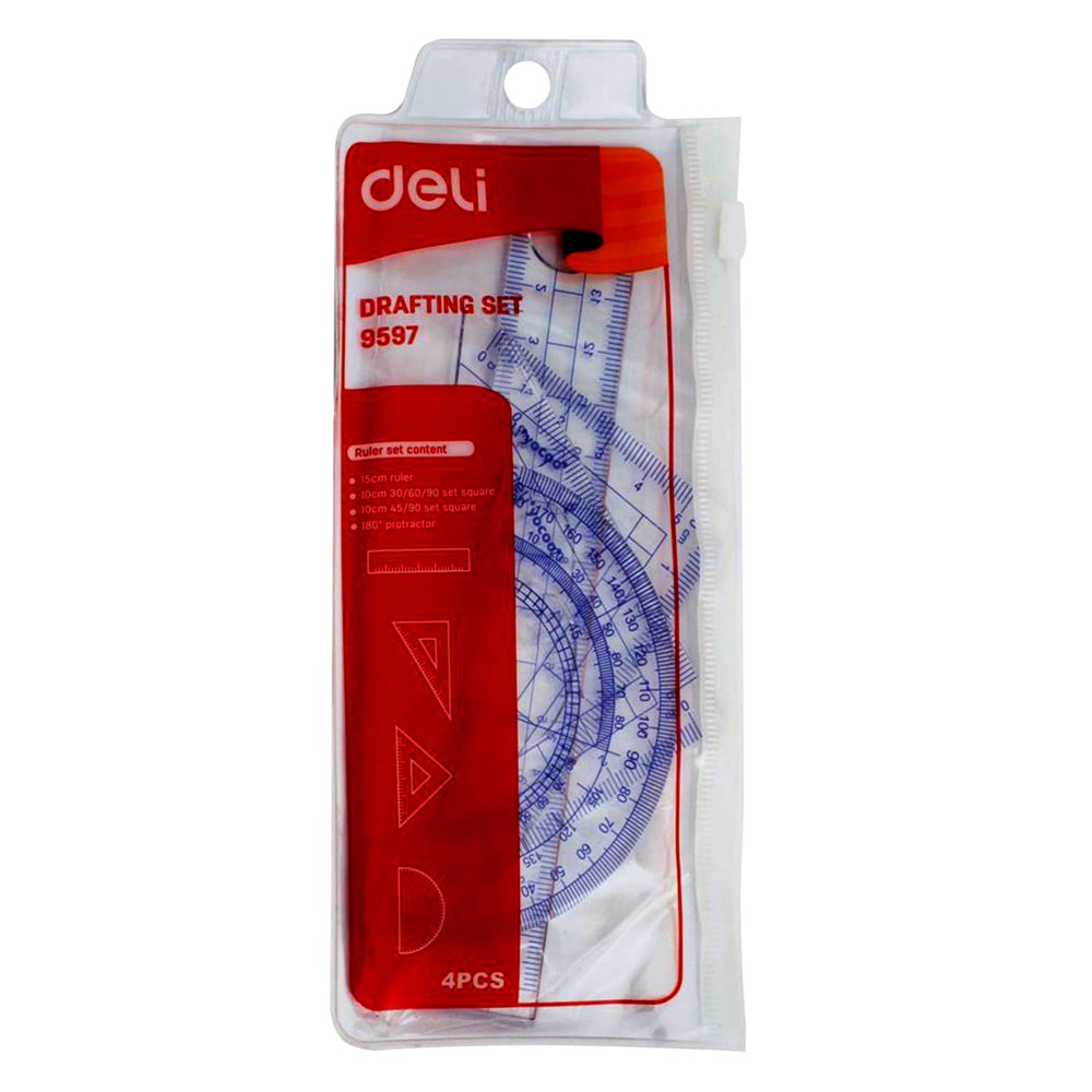 Deli ruler set which contains ruler, 2 triangles and rapporteur.