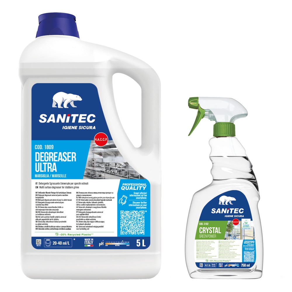 This detergent set from Sanitec includes two quality products for cleaning different surfaces at home. The degreaser with a capacity of 5 liters is suitable for cleaning the house, acting efficiently in removing oil, dust and other pollutants. Green Power Vetri in a capacity of 750 ml is a specialized detergent for windows and glass surfaces, offering a clean and bright appearance.