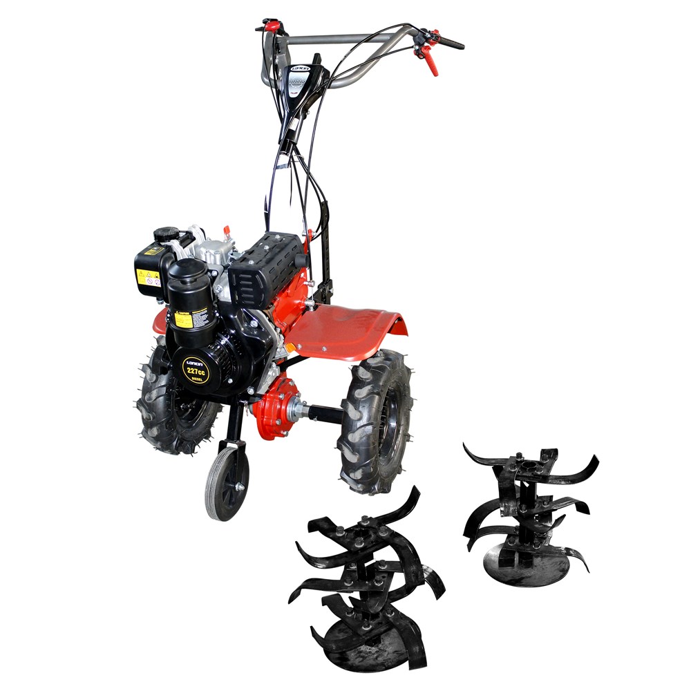 Milling land 227CC (4-stroke diesel engine) 3600 RPM with knives forward. Milling is equipped with 2-speed front and 1 march back to use easier and lighter rope mechanism. Milling knives are made from reinforced steel to carry out cultivation and work more efficiently. Equipped with removable tires for easy transport. Milling light before I made with the fuel filling + SAE 15W40 engine oil lubricant oil / SAE kamijo based on the level 140W milling machines is widely used in viticulture / light's agricultural land / farm etc.