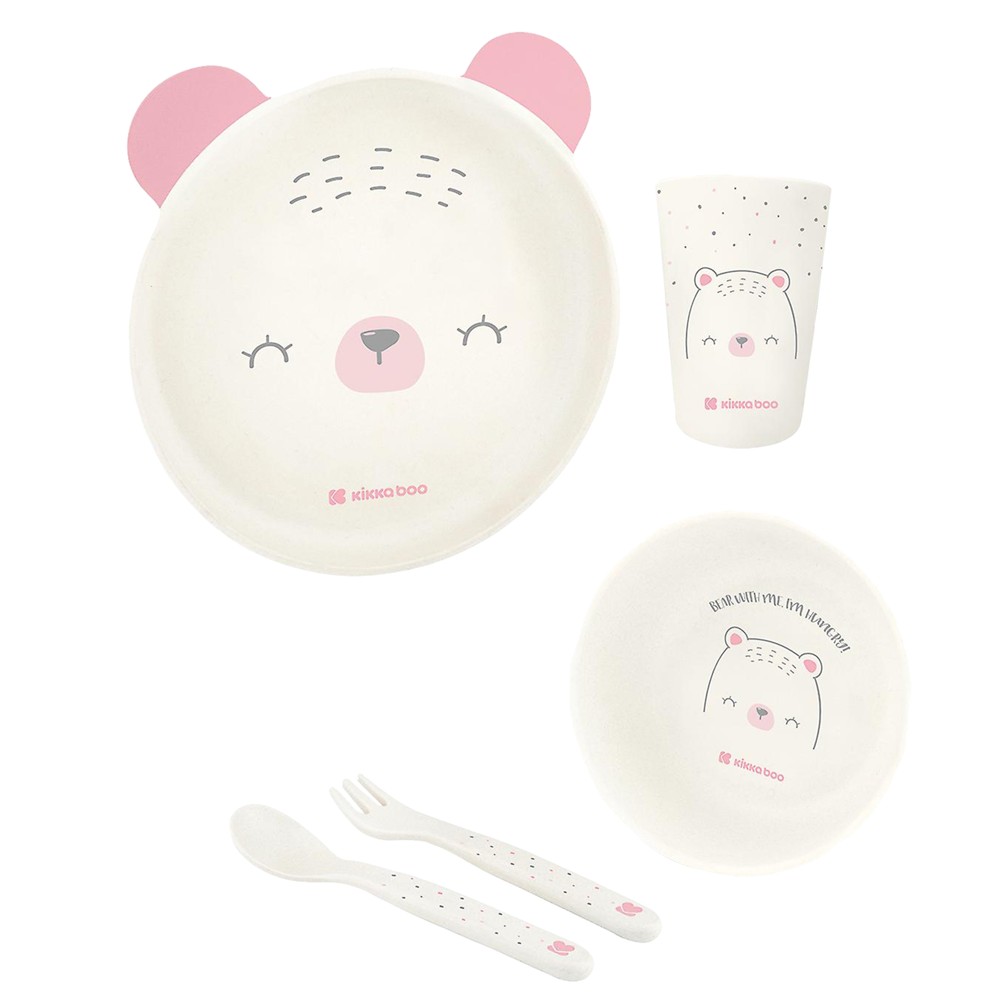 Baby food set, with bear design, in white and pink. The set contains a plate for placing food, a bowl, a glass of water, a spoon and a fork. It is used by children at home, picnic or other activities. This product is practical to use and easy to clean.