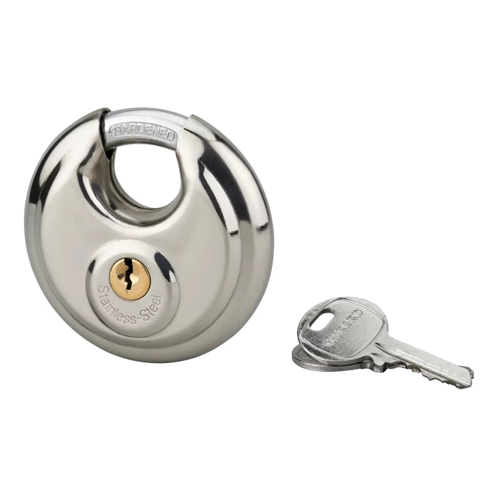 Dry në formë disku 70mm me trup çeliku inox, hark çeliku të ngurtësuar, me mekanizëm me kunja dhe me 2 çelësa bronzi të veshur me nikel.
