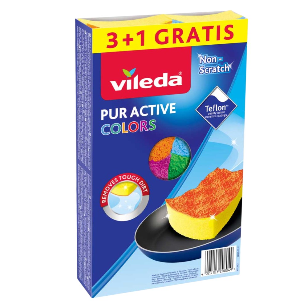 Vileda Pur Active Colors 3+1 dish sponge is a set of colorful sponges for efficient dishwashing. With abrasive parts treated with “Pur Active” technology, it helps remove dirt and grease without scratching delicate dish surfaces, including those with Teflon coatings or sensitive materials. With strong polyurethane material and a soft abrasive surface, the sponges help remove tough dirt, while being gentle on dish surfaces and your hands.
