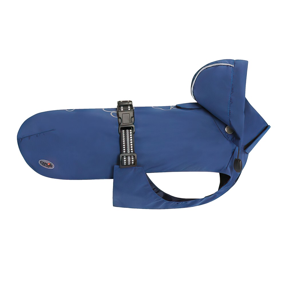 Lightweight unlined water resistant raincoat, detachable hood with press studs. Reflective inserts on the hood and, with a footprint pattern, on the back. Equipped with drawstring to adjust the width of the neck. Reflective wrap closure. Opening with small flap for the collar and elastic bands for the hind legs.