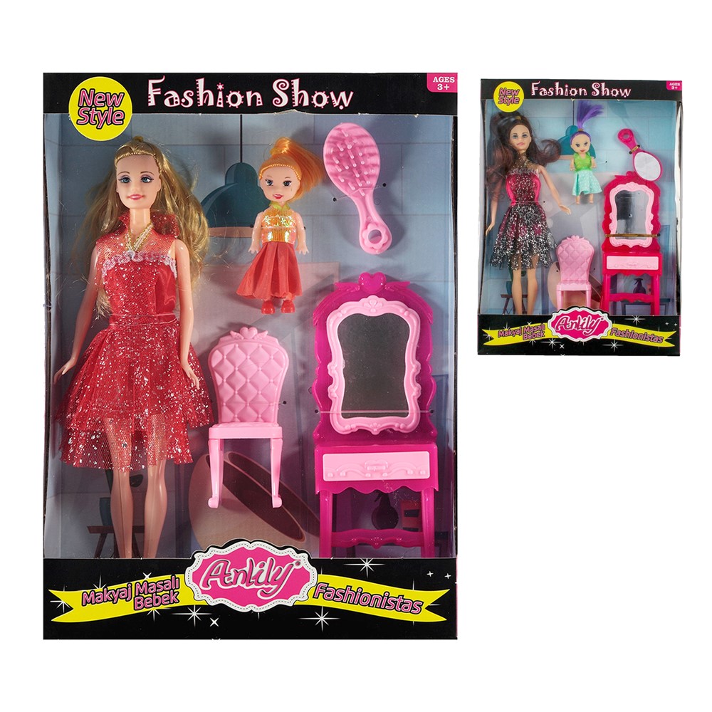 Toy set for girls, which includes a doll, a baby doll, a chair, a hair brush and a dressing table, with mirror and storage. This set helps to develop the imagination, stimulates the development of the sensory skills and the development of learning skills in children, through role play. The constituent material and paint have no content that can be toxic or harmful for children and the product is certified for safety in use. This product is suitable for use by children over 3 years old.