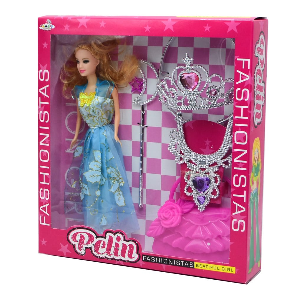 Doll with accessories toy set for kids, which contains a doll, a tiara, a handbag and other accessories, made of plastic and synthetic polyester material, in different colors. This toy helps to develop fine motor skills, it develops hand and eye coordination, develops the sensory skills and it stimulates imagination and creativity in children. The constituent material and the paint have no toxic or harmful composition for children and the product is certified for children's safety. This product is suitable for use by children over 3 years old.