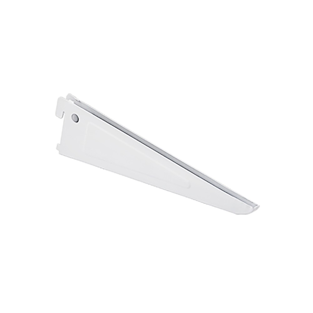 Double shelf bracket, made of metallic material, in white color, which is suitable for single-slotted shelving systems. The constituent material is resistant to use, heavy weights, rust or abrasion. This product is suitable for use in the construction of LSS (Long Span Storage) shelving structures that are placed in toilets, hotel laundries, basements of houses, offices or various workshops, to help in organizing the limited spaces.