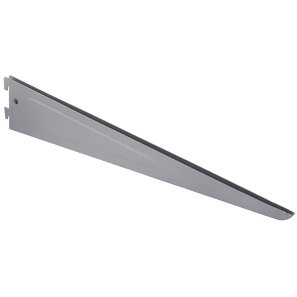 Double shelf bracket, made of metallic material, in grey color, which is suitable for single-slotted shelving systems. The constituent material is resistant to use, heavy weights, rust or abrasion. This product is suitable for use in the construction of LSS (Long Span Storage) shelving structures that are placed in toilets, hotel laundries, basements of houses, offices or various workshops, to help in organizing the limited spaces.