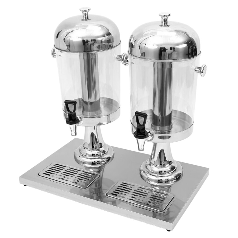 This double juice dispenser is an elegant and functional appliance, designed to serve two different types of juices simultaneously in hotels, restaurants, buffets, and events. With its dual 10-liter capacity (5 liters per container), it offers a practical solution for serving juices in large quantities. It features two separate containers for two types of juices. The combination of stainless steel and plexiglass ensures durability, hygiene, and transparency. The easy-to-clean materials ensure maximum hygiene and safe use. The juice dispensing mechanism is simple and easy to use, minimizing spills and mess. The clear and transparent appearance allows customers to see the juices inside. It's suitable for various juices, such as orange juice, apple juice, water, etc.