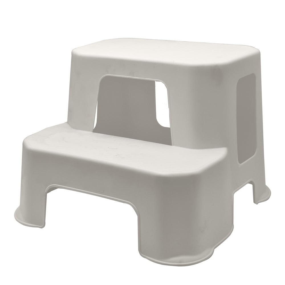 Double-step stool for children, made of plastic material, in beige color, equipped with bordered support legs, to protect against slipping. It is used to help teach young children to use the adults' toilet, as well as to easily reach the sink for washing hands or for brushing teeth. This product is suitable for use by children over 2 years old.