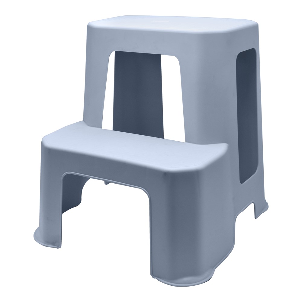 Double-step stool for children, made of plastic material, in light blue color, equipped with bordered support legs, to protect against slipping. It is used to help teach young children to use the adults' toilet, as well as to easily reach the sink for washing hands or for brushing teeth. This product is suitable for use by children over 2 years old.
