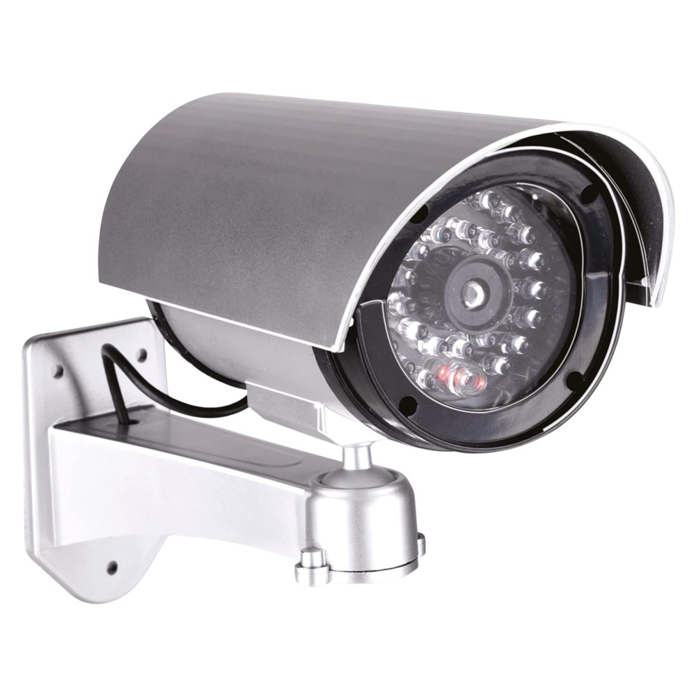 Dummy security camera with LED 11 x 8 x 17 cm. This realistic dummy camera deters burglars by the LED light that flashes, making it seem as if the camera is recording. Works on 2x AA batteries, not included. Including mounting material. Material: plastic. Dimensions (including stand): approximately 11 x 8 x 17 cm. Suitable for indoor and outdoor use, hang protected from rain. Security material/security camera burglary protection.