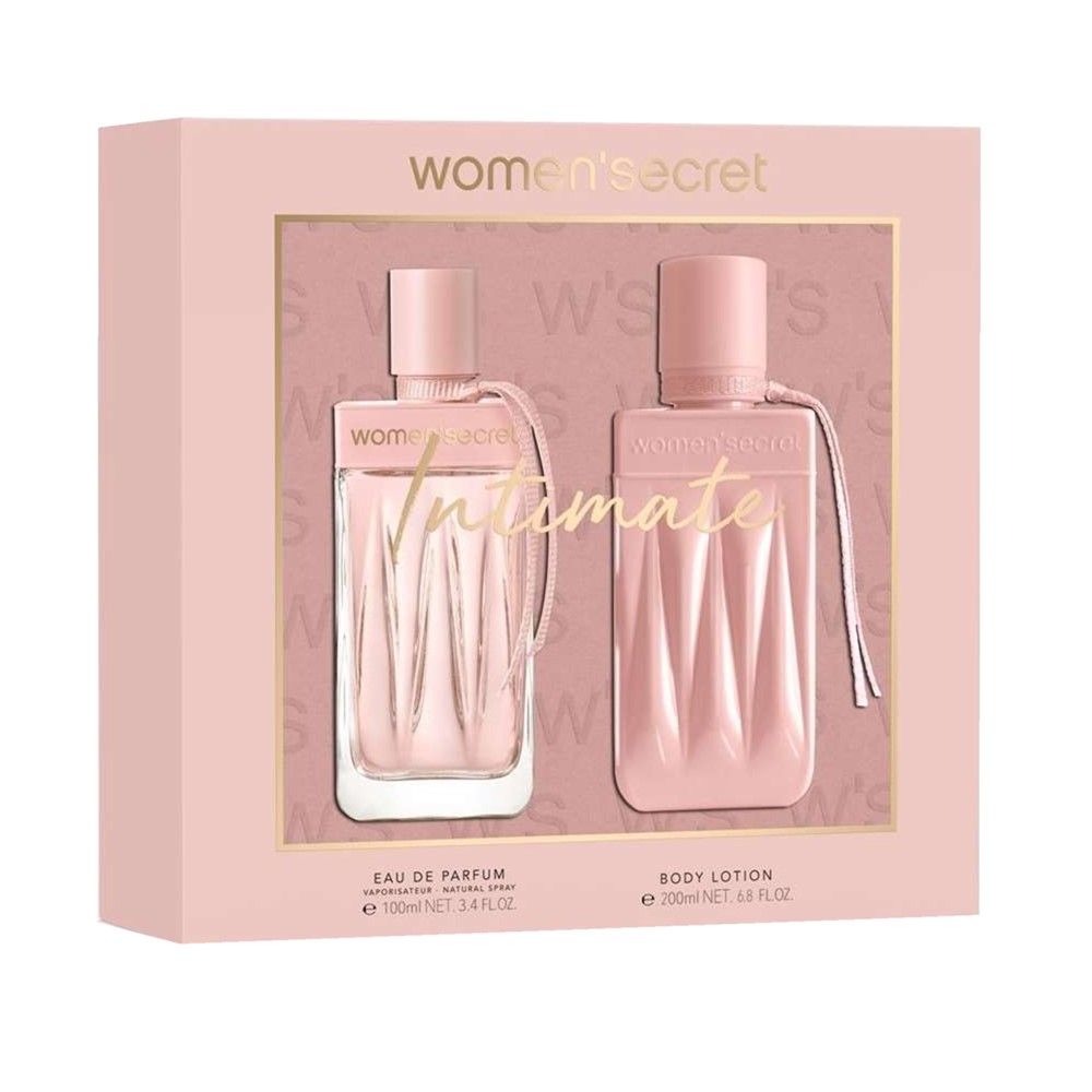 Gift set for women, which contains eau de parfum (EDP), with a concentration of 15-20% of essential oils (perfume), enriched with mandarin essential oil, pink peppercorns, Sambac jasmine essence, almond blossom extract, sandalwood, white musk and Tonka beans extract. It has a delicate aroma of exotic flowers and fruits. The set also contains a perfumed lotion for body skin care.
