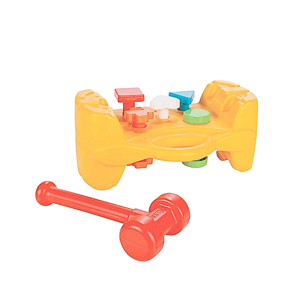 Educational game for kids, made of plastic material, in yellow and red colors, which includes a toy hammer and a work bench with assorted geometric shapes. The set can be used by children for play, it stimulates the visual perception skills of the child, it helps with the coordination of the eyes and hands and it contributes to the easier recognition of different shapes and colors. This product is suitable for children over 12 months.
