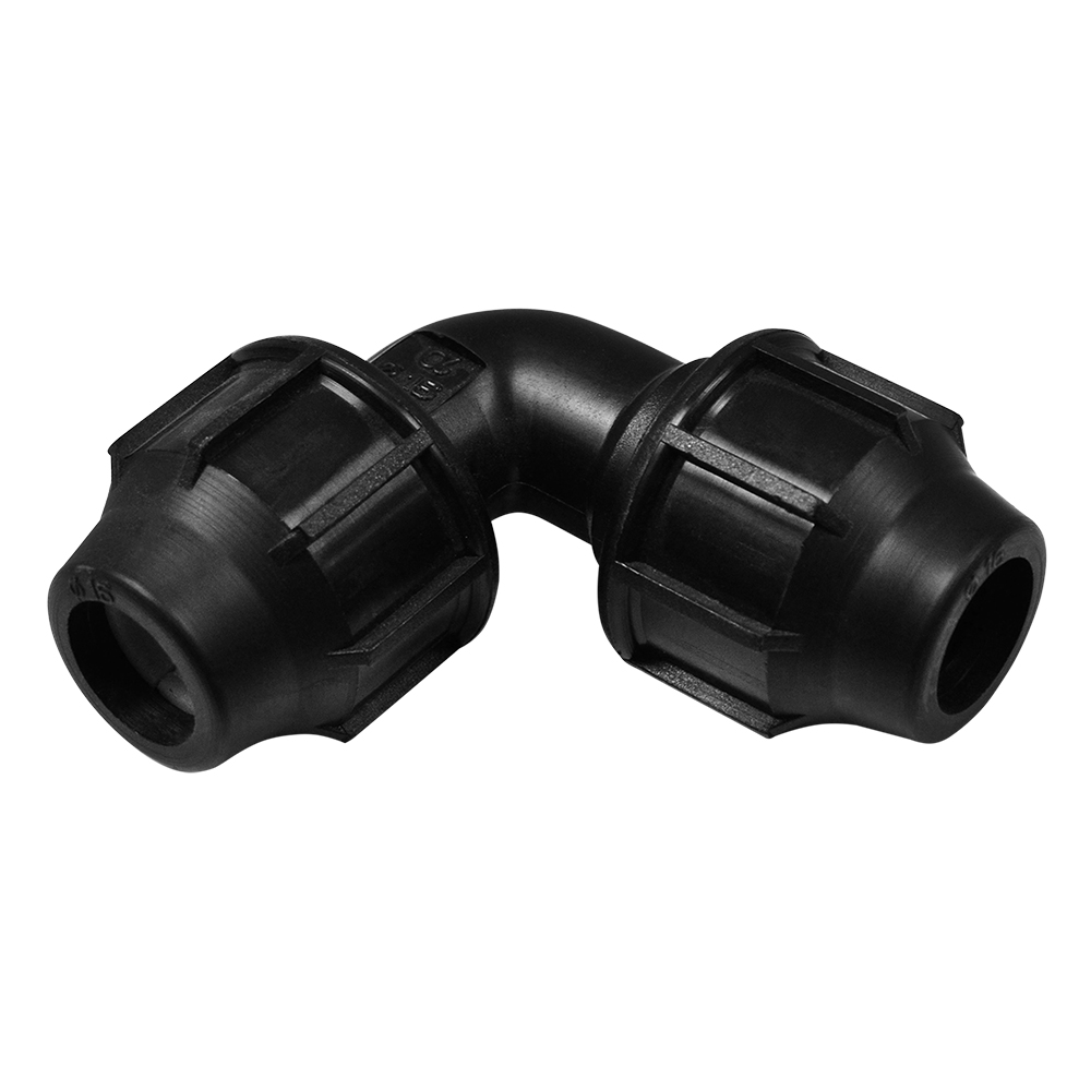 Elbow with faucet of PP 16x16mm with angle 90° used to installations angular water supply infrastructure lines, in irrigation and agricul, etc. The elbow enables network returns 90° angle. Elbow network connects two pipes through coercive mechanical faucet. Manufactured with European standards, resistant to corrosive materials designed to withstand pressure up to 16bar.