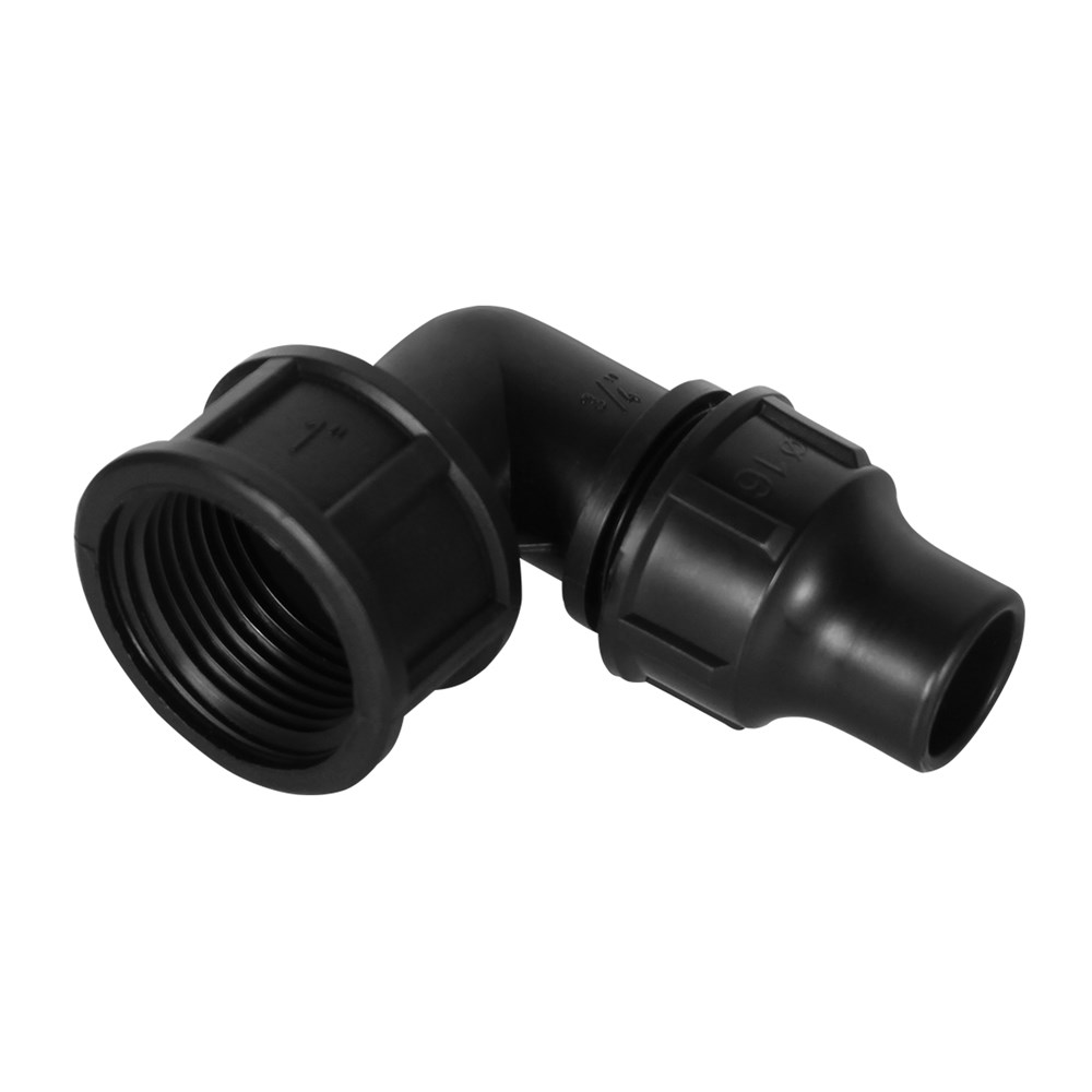 Elbow with faucet of PE 16x1" female with angle 90°. Used to installations angular water supply infrastructure lines, in irrigation and agricul, etc. This elbow enables network branching 90° angle. This elbow connect LDPE pipe Ø 16 with other fittings by fillet, for joining the fillet recommend tu use teflon whiles pipe connect whith elbow in mechanically with faucet. Manufactured with European standards, resistant to corrosive materials designed to withstand pressure up to 6 Bar.