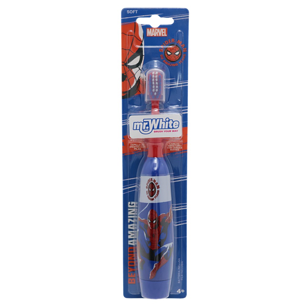 This Spiderman electric toothbrush is specially designed for children over 4 years old, combining functionality with their favorite design. With its red color and illustration of the Spiderman character, it makes brushing your teeth a pleasant and fun activity every day. It works with a replaceable 1.5V AA battery (included).