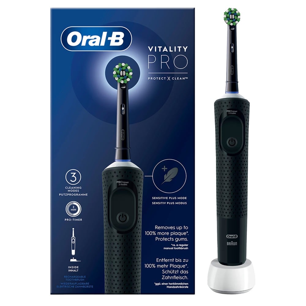 The Oral-B Vitality Pro Rechargeable Electric Toothbrush provides clinically proven superior cleaning compared to traditional manual toothbrushes. The Vitality Pro has 3 brushing programs: Daily Cleaning, Sensitive and Sensitive Plus for an amazingly gentle tooth brushing experience. The timer in the handpiece helps you adhere to the dentist-recommended brushing time of 2 minutes. Thorough cleaning thanks to 2D technology. Green bristles turn yellow when it's time to change the brush head.