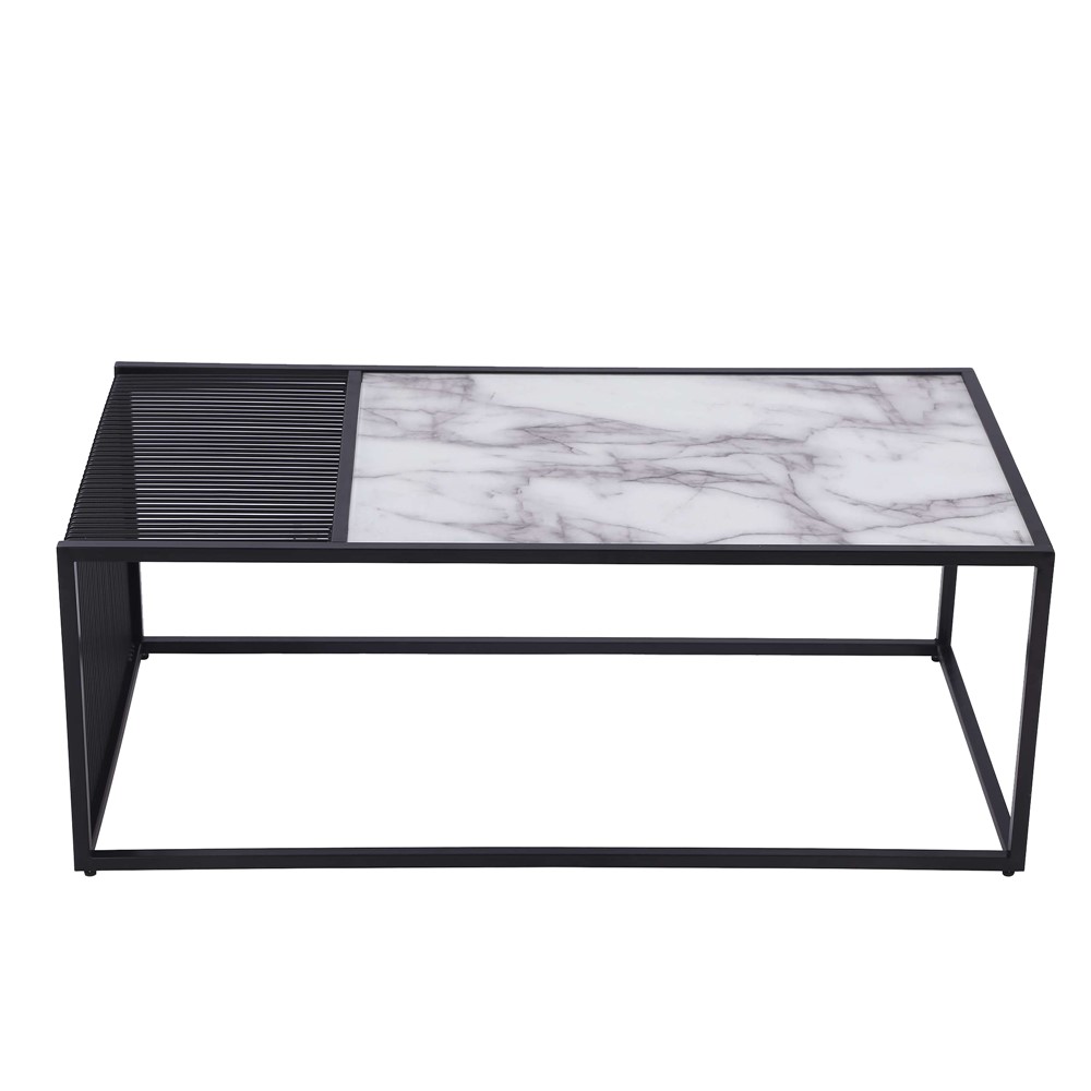 Coffee table, with a support structure made of metallic rods, with a height of 46 cm, in black color. The table is equipped with a rectangular-shaped table top, made of tempered glass as a core panel, with a thickness of 0.6 cm and dimensions of 120x60 cm, in gray and white color. It can be used as a functional piece of furniture, for serving coffee or other drinks, and as a decorative object in decorating indoor environments of houses, living rooms and hotel lobbies.