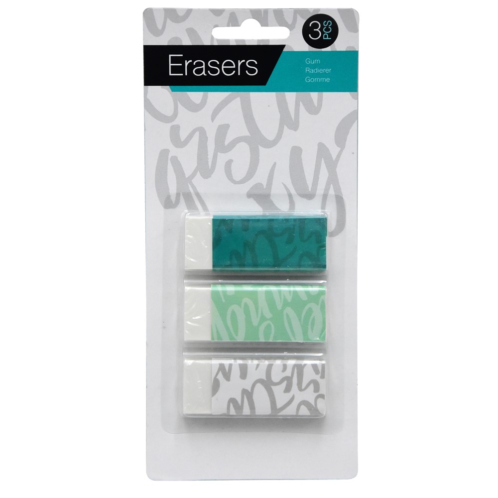 Pencil eraser set, made of durable rubber material, in rectangular shape and in different colors. It is used to correct pencil errors in drawings or notes, and it leaves no marks on the sheet of paper after use. This product is suitable for use by children over 3 years old.