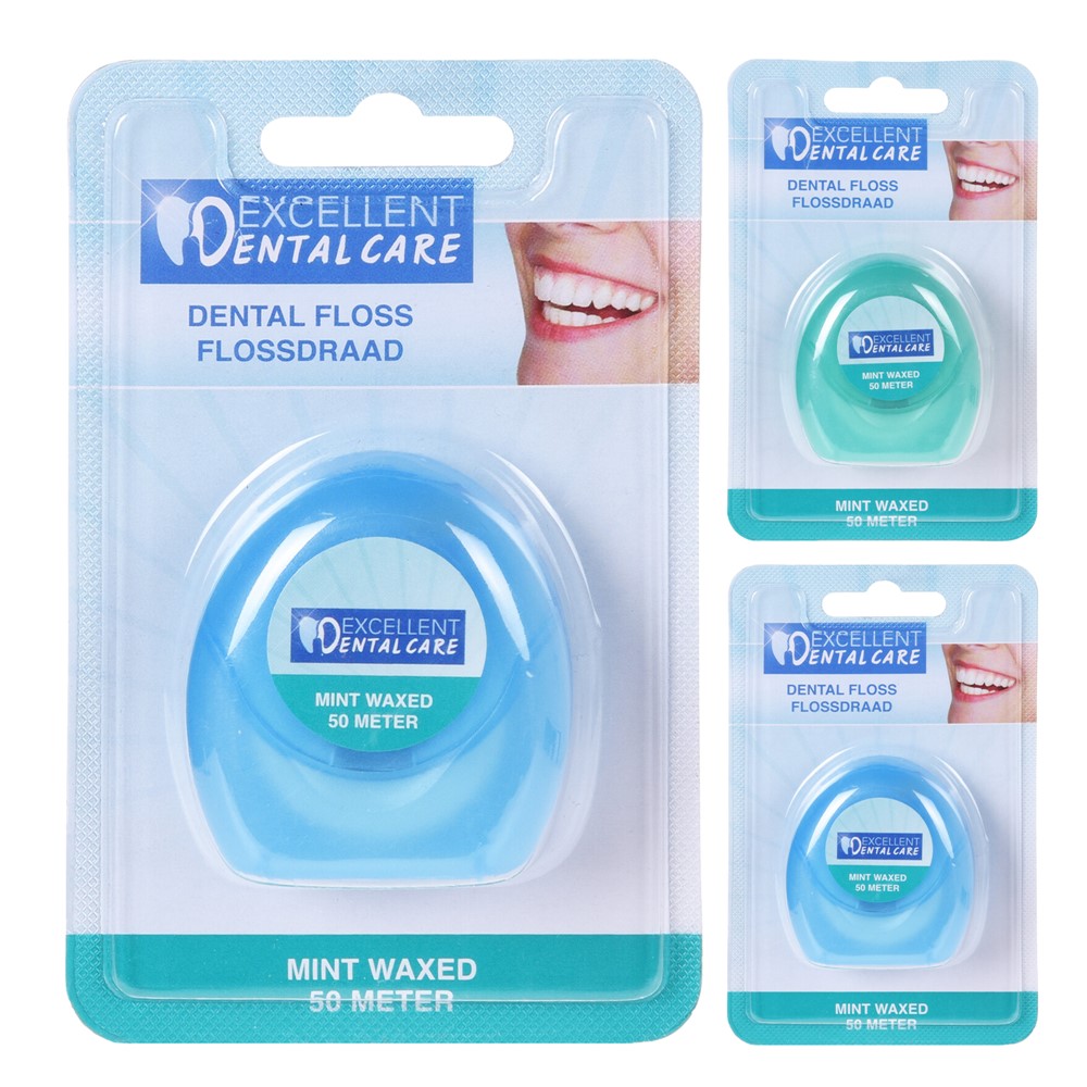 Dental floss 50 meters, dental floss 50 meters for a radiant smile. The thread is made of 630D nylon with a mint wax coating for a fresh taste. they serve to clean food residues in the spaces between the teeth.