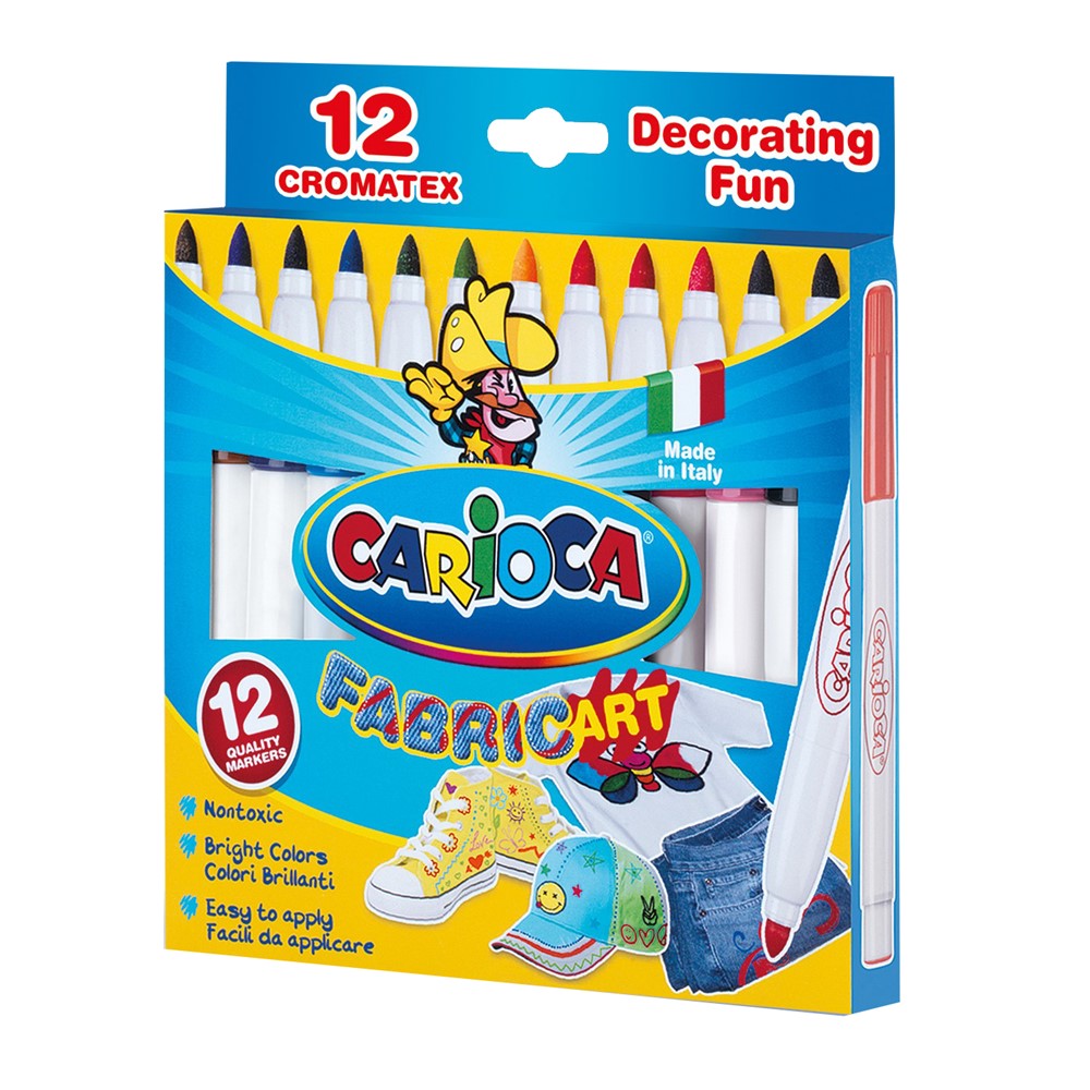 Fabric colored felt-tip pens for kids, made of durable plastic material, with a protective cap, with a reinforced tip of 6 mm diameter, that resists the pressure exerted by the children's hand and with a line width of 2.6 mm. They contain dermatologically tested and non-toxic permanent ink. The pens are used in schools and kindergartens, to draw or color and help develop imagination and creativity in children. This product is suitable for use by children over 3 years old.