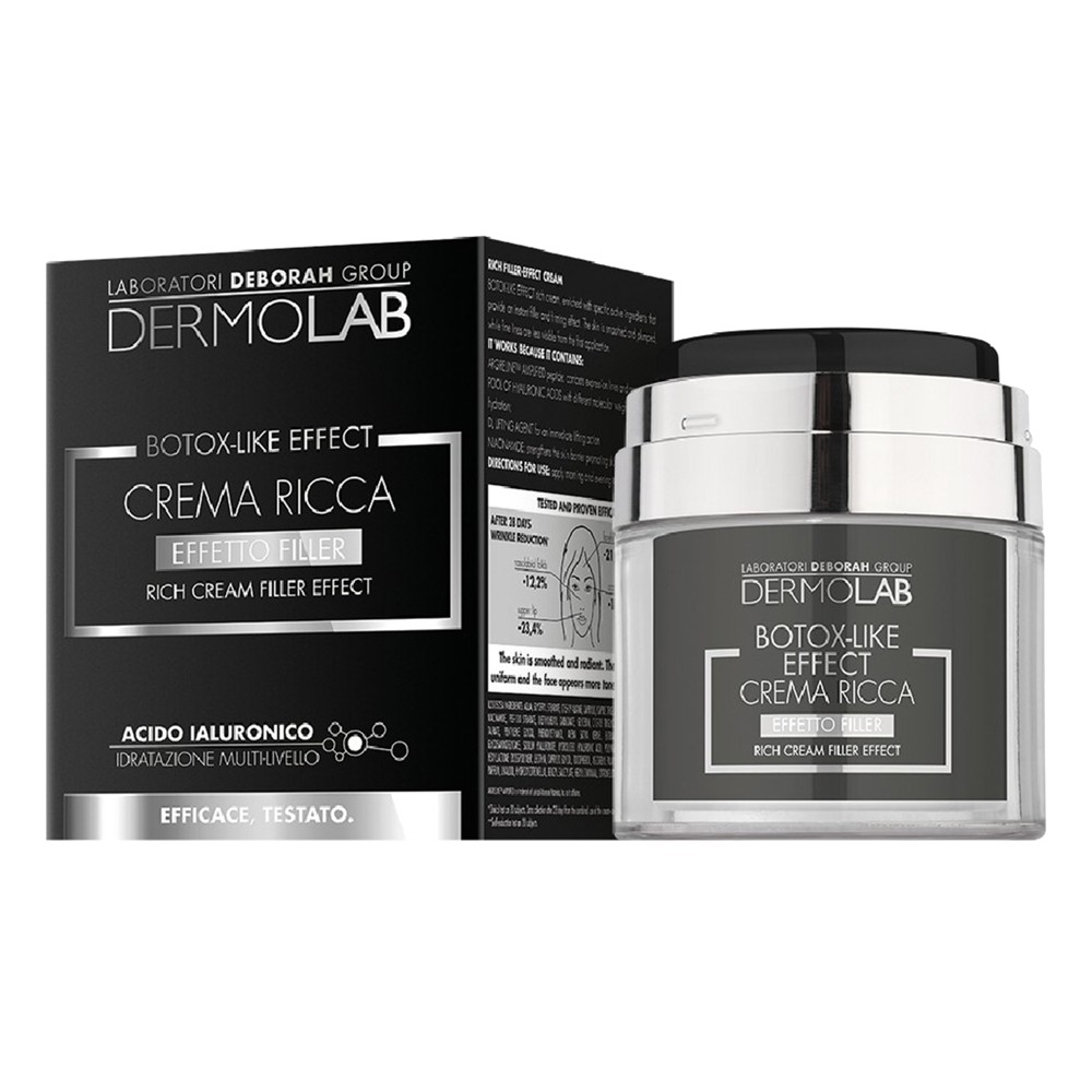 Rich cream with BOTOX-LIKE effect, enriched with specific active ingredients that provide an immediate plumping and tightening effect. The skin is smoothed and plumped, while fine wrinkles are less visible from the first application. Hyaluronic acid drops with different molecular weights guarantee hydration on many levels. Argirelinetm amplified peptide fights expression lines and prevents skin aging. Niacinamide strengthens the skin barrier, promoting skin radiance. DL lifting agent provides an immediate lifting effect.